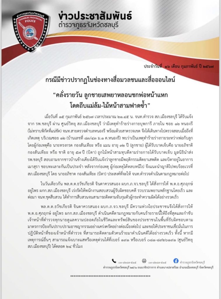 สภ.เมืองชลบุรี โดย นายอภิชาต กองสันเทียะ (บิดา) ประสงค์ที่จะให้ จนท.ตำรวจดำเนินตามกฎหมายต่อไป