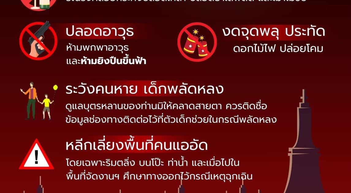 3.งดการจุดพลุ ประทัด ดอกไม้ไฟ และงดการปล่อยโคม โดยเฉพาะเขตพื้นที่ห้าม ที่กระทบการบิน ซึ่งอันตรายจากโคมยังอาจทำให้เกิดอัคคีภัยได้