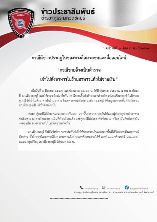 เมื่อวันที่ 1 มีนาคม 2567 เวลาประมาณ 21.30 น. ได้มีกลุ่มชาย ประมาณ 5 คน พากันมาที่ สภ.เมืองชลบุรี และได้เจรจาไกล่เกลี่ยกัน กรณีชายเสื้อดำลักษณะคล้ายตำรวจโดยเป็นการเข้าใจผิดของคู่กรณี ได้เข้าไปสั่งอาหารในร้านอาหาร ในเขต ต.ดอนหัวฬ่อ อ.เมือง จ.ชลบุรี (ซึ่งอยู่นอกเขตพื้นที่รับผิดชอบ สภ.เมืองชลบุรี) แล้วไม่จ่ายเงินนั้น